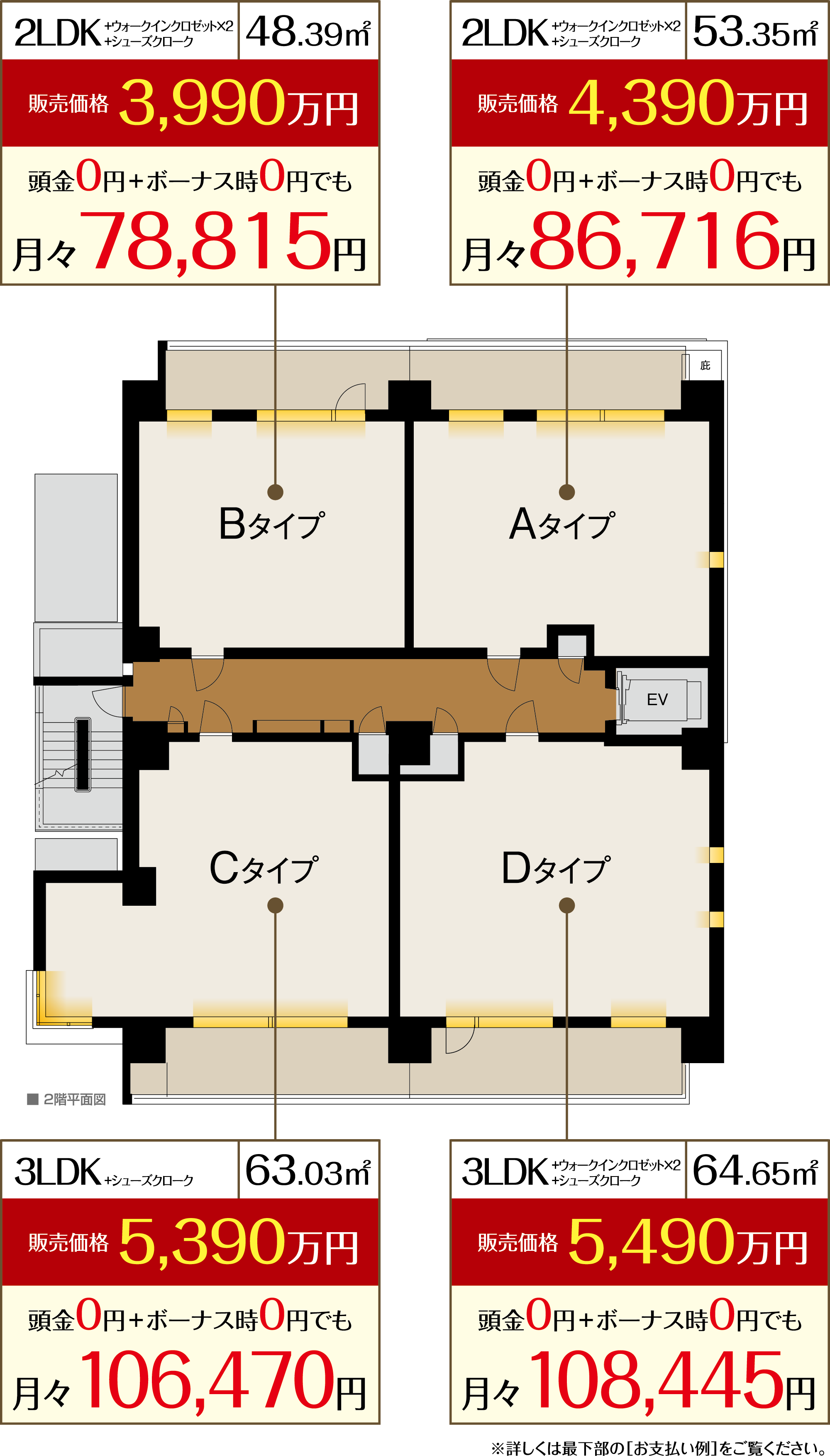 [お支払い例]●Aタイプ201号室/販売価格(税込)4,390万円、紹介ローン利用、変動金利0.699%・元利均等50年返済でご購入の場合、頭金0円、借入額4,390万円、ボーナス時0円、月々返済額86,716円(年12回)。●Bタイプ202号室/販売価格(税込)3,990万円、紹介ローン利用、変動金利0.699%・元利均等50年返済でご購入の場合、頭金0円、借入額3,990万円、ボーナス時0円、月々返済額78,815円(年12回)。●Cタイプ203号室/販売価格(税込)5,390万円、紹介ローン利用、変動金利0.699%・元利均等50年返済でご購入の場合、頭金0円、借入額5,390万円、ボーナス時0円、月々返済額106,470円(年12回)。●Dタイプ204号室/販売価格(税込)5,490万円、紹介ローン利用、変動金利0.699%・元利均等50年返済でご購入の場合、頭金0円、借入額5,490万円、ボーナス時0円、月々返済額108,445円(年12回)。[ローンのご案内]●取扱金融機関/ネット銀行●融資限度額/500万円~2億円●利率/変動金利0.699%●返済方法/元利均等返済(ボーナス返済併用可)●期間/借入期間は1年以上50年以下※金利は2025年11月現在のものです。※融資を受けるには所定の審査が必要です。審査結果によりご希望に添えない場合があります。※適用金利は、申し込み時ではなく、融資実行時(引渡し時)の金利となります。※融資条件、金利等、金融情勢により変更される場合があります。※返済額に管理費等は含まれておりません。※購入時には別途、諸費用が必要です。(登録料・保証料等)