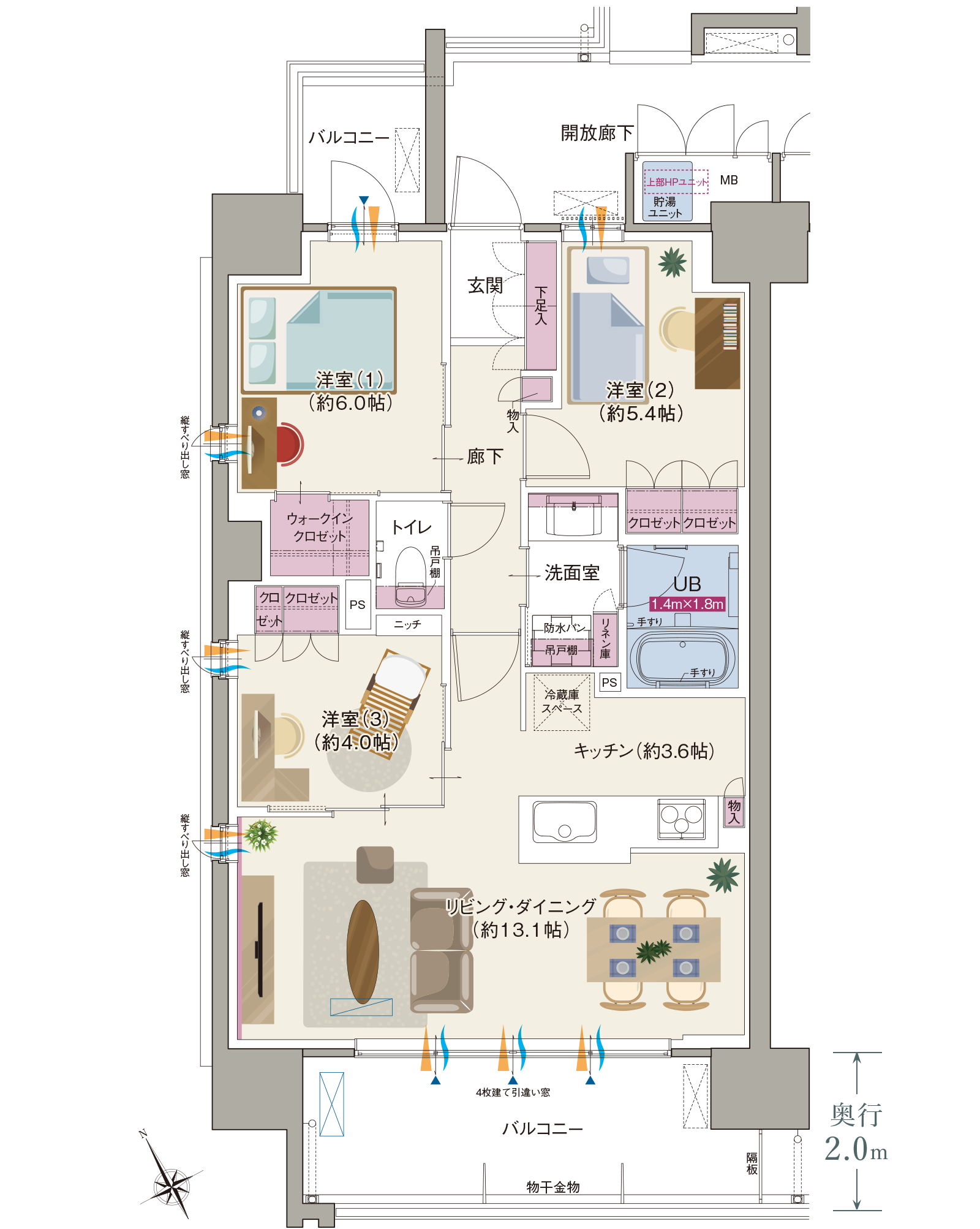 ■2面バルコニー・3面採光の明るい角住戸