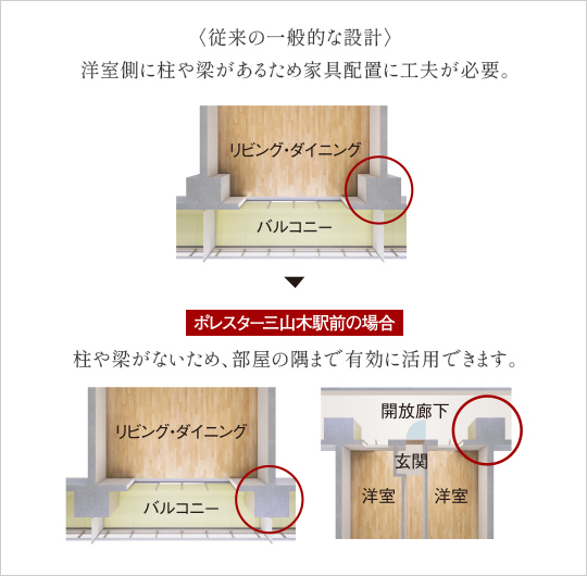 梁や柱をバルコニー・開放廊下側に押し出すアウトポール設計。
