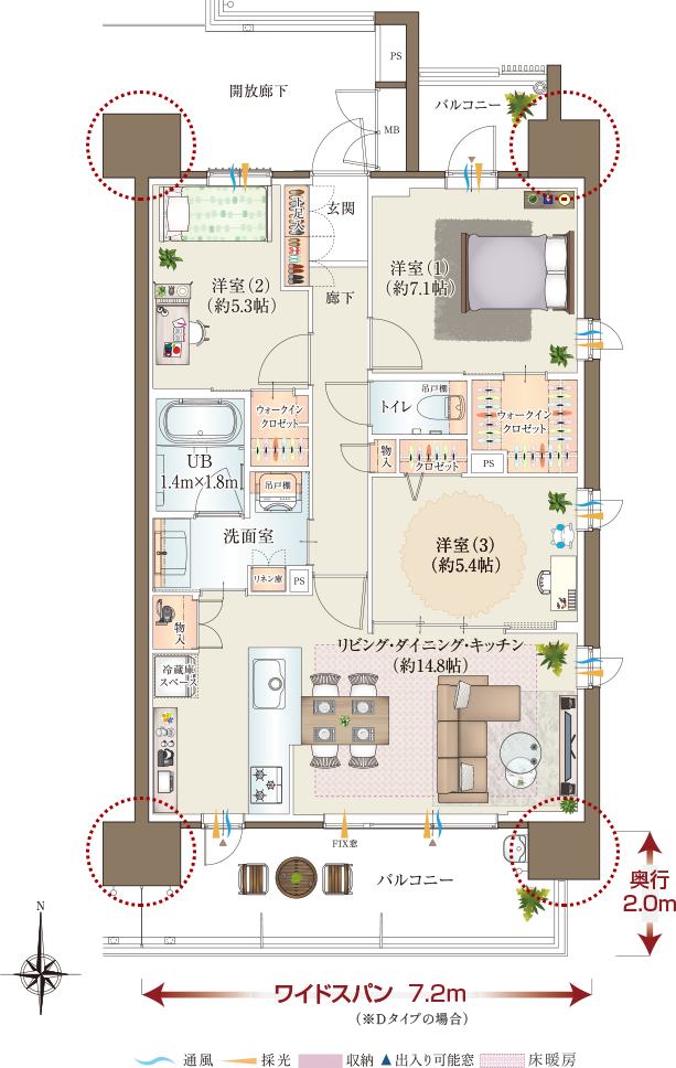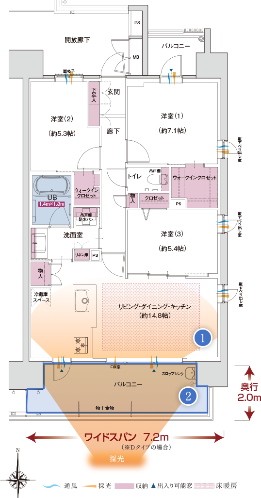 Aタイプ・Dタイプは幅約7.0m以上のワイドスパン設計。メインバルコニーの開口が広いため、採光面積が広くなり、採光量も増加。住戸の奥まで光が届く、明るいリビングを実現します。