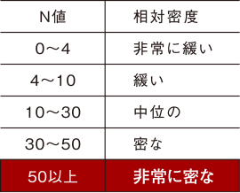 標準貫入試験によって求められた、地盤の強度を表す単位のことです。標準貫入試験とは、63.5kgの重りを76cmの高さから自由落下させて鋼製棒を打ち込むという試験で、その鋼製棒を土中に30cm打ち込む(貫入させる)のに要する打撃回数を測定します。落下打撃回数の値がN値で、その数が多いほど地盤が硬いということになります。