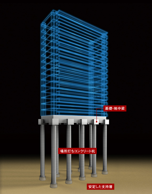 綿密な地盤調査により検出した、地下約14m、N値60以上の硬い支持層に13本の場所打ちコンクリート杭を打設。現場の地盤に適した深さに多数の杭を埋め込むことで強固な建物構造を実現しています。