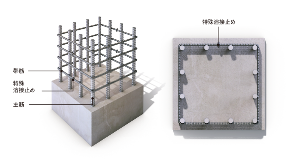 建物を支える柱の主筋を水平方向に束ね、主筋とコンクリートを拘束する役割を果たす外周部の帯筋には、溶接閉鎖型帯筋を採用。通常の帯筋に比べ、せん断力に対する拘束力が高く、建物に粘り強さを持たせます。