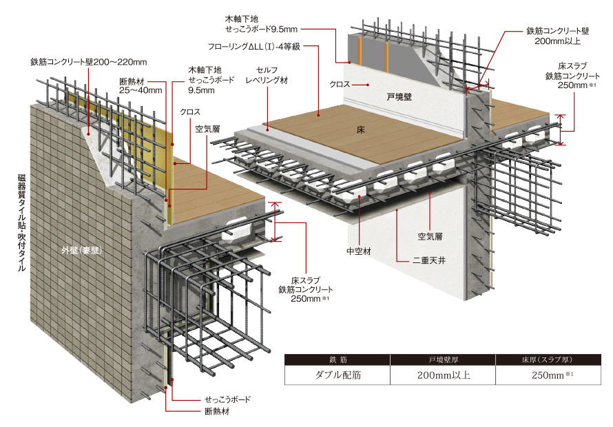 耐震性を保ち、プライバシーを守る住戸と住戸の間の戸境壁は、快適な住空間を実現する200mm厚以上を確保。耐力壁として、しっかりとした構造と厚みを持たせています。また、床の厚さを意味するスラブ厚は250mmとしています※1。※1:ユニットバス部分など、一部スラブ厚が異なります。