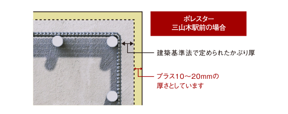 長く建物の性能を保つために重要なポイントとなる、鉄筋を覆うコンクリートのかぶり厚は、建築基準法で定められたかぶり厚よりもプラス10mmの厚さとしています。また、打放し仕上げ部分はさらにプラス10mm以上、合計20mmのかぶり厚として鉄筋の劣化を抑制しています。