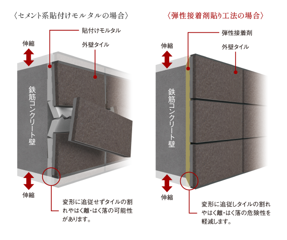 外壁タイルには、弾性接着剤貼り工法を採用。セメント系貼り付けモルタルに比べ、接着剤層の弾性でコンクリートの乾燥収縮率等による変形に追従し、タイルの浮きやはく離・はく落の危険性を軽減します。