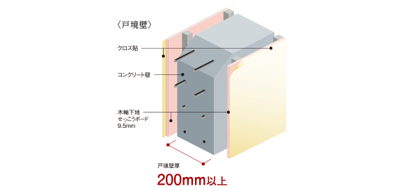 隣戸への音漏れに関係する戸境壁のコンクリート厚は、200mm厚以上として、日常生活に不便のない遮音性を実現しています。※壁厚に関しては、一部異なる場合があります。