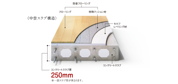 生活音の中で低音域の重い音(重量衝撃音)に対しては、250mmの中空スラブ構造を、高音域の軽い音(軽量衝撃音)に対しては軽量床衝撃音低減性能がΔLL(Ⅰ)-4等級のフローリング材を採用し階下への音の伝わりを抑えています。※防音フローリングの遮音等級は、JISが定めた実験方法によるデータに基付いてメーカーが表示したものであり、竣工後の実際の住戸内における遮音性能を示すものではありません。