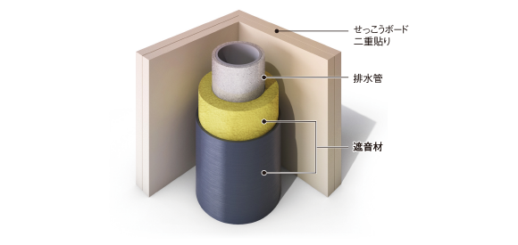 排水縦管からの流水音を軽減するため管を遮音材で巻き、二重貼りせっこうボード壁で包みました。※排水管の遮音材料はメーカーにより異なる場合があります。