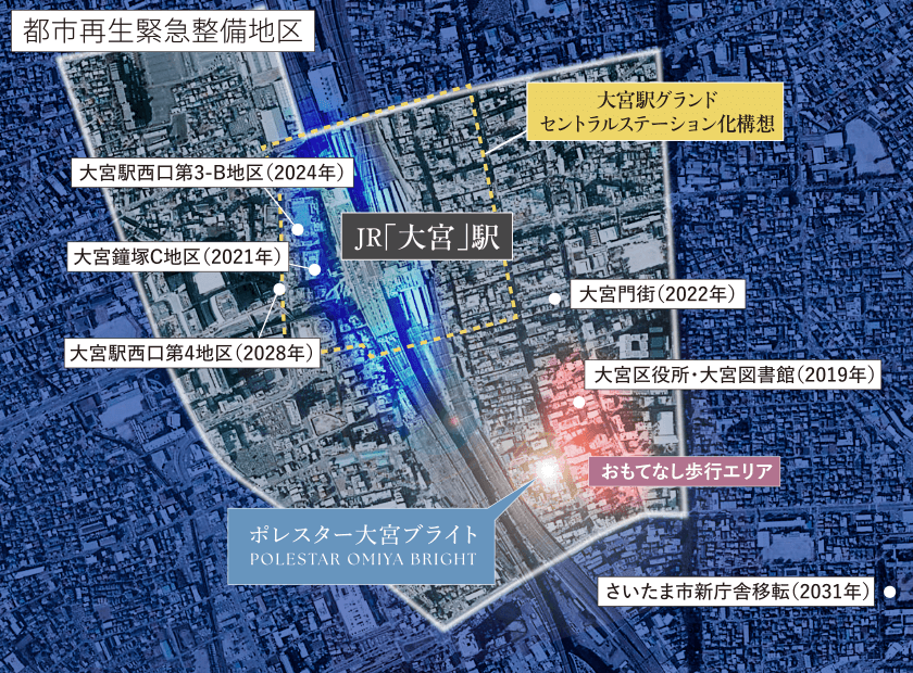 ※掲載の航空写真は、2025年11月に撮影したものに「ポレスター大宮ブライト」のおよその位置を示したもので、実際とは異なります。