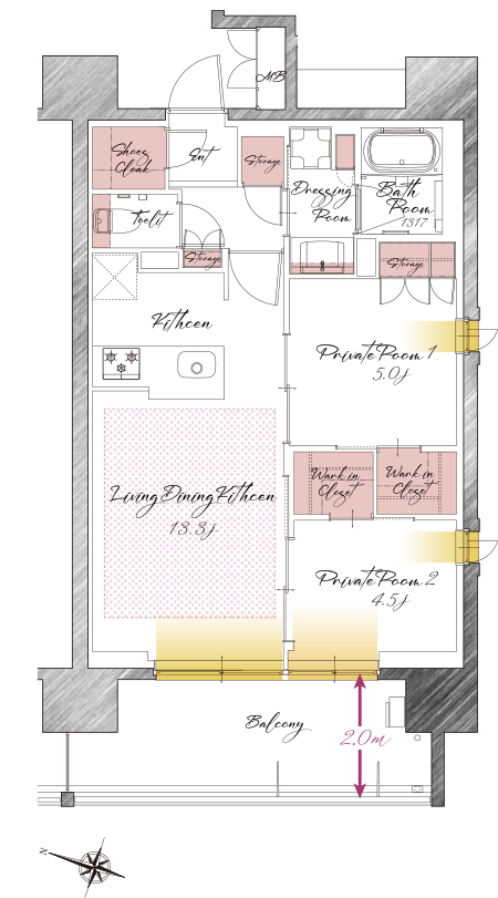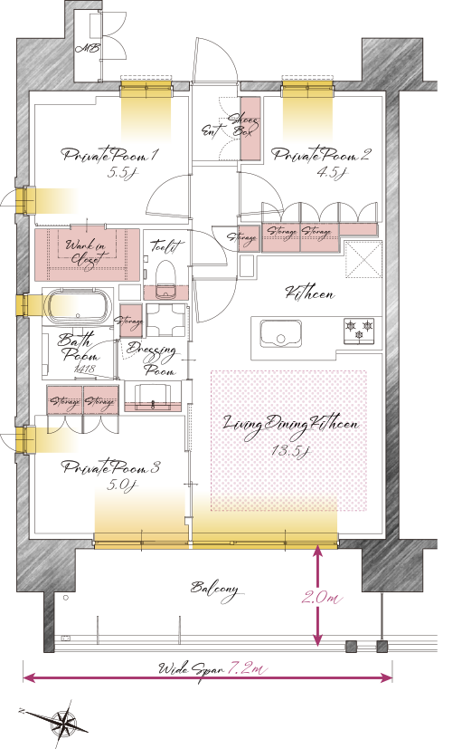 住戸フロアは、東西に分かれた住棟配置により、角住戸率を100%を実現。
