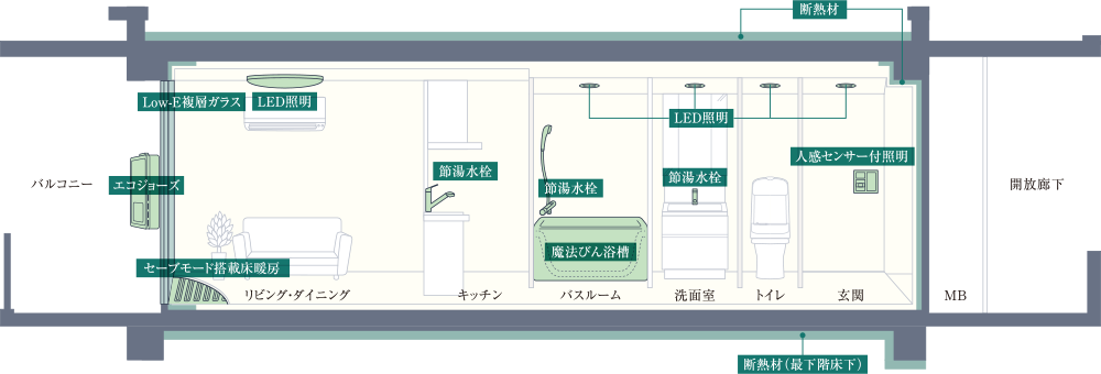 「高効率設備」を採用し、エネルギーの使用量削減効果を実現します。高断熱性能との組み合わせで光熱費を抑えることができ、地球にも家計にも優しい暮らしをもたらします。