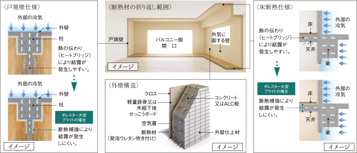 外壁の室内側に設けた断熱材に加え、建物の外部に面するスラブや戸境壁の一部には、ヒートブリッジ対策として断熱材を折り返し施工することにより、冷気・熱気の侵入を抑え、冬暖かく、夏涼しい快適な室内環境を保ちます。