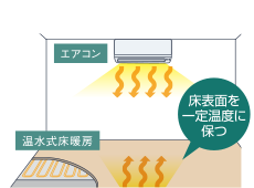 セーブモードを利用し床暖房の出力を抑え、エアコンと併用運転することで、省エネ性を高めます。