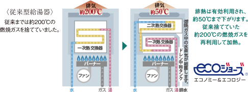 従来型給湯器では捨てていた約200℃の燃焼ガスを再利用して加熱する、高効率の給湯器を採用しています。