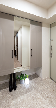 フルシーズンの靴を収納できるトールタイプの下足入を設置しました。身だしなみをチェックできるよう鏡付扉を採用し、傘立やスリッパ収納を備えるなど、玄関まわりをスッキリと演出する豊富な収納力です。