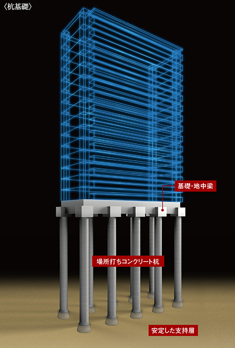 綿密な地盤調査により検出した、N値50以上の硬い支持層に長さ約49mの場所打ちコンクリート杭12本を打設。現場の地盤に適した深さに多数の杭を埋め込むことで強固な建物構造を実現しています。