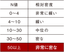 標準貫入試験によって求められた、地盤の強度を表す単位のことです。標準貫入試験とは、63.5kgの重りを76cmの高さから自由落下させて鋼製棒を打ち込むという試験で、その鋼製棒を土中に30cm打ち込む(貫入させる)のに要する打撃回数を測定します。落下打撃回数の値がN値で、その数が多いほど地盤が硬いということになります。