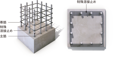 建物を支える柱の主筋を水平方向に束ね、主筋とコンクリートを拘束する役割を果たす外周部の帯筋には、溶接閉鎖型帯筋を採用。通常の帯筋に比べ、せん断力に対する拘束力が高く、建物に粘り強さを持たせます。