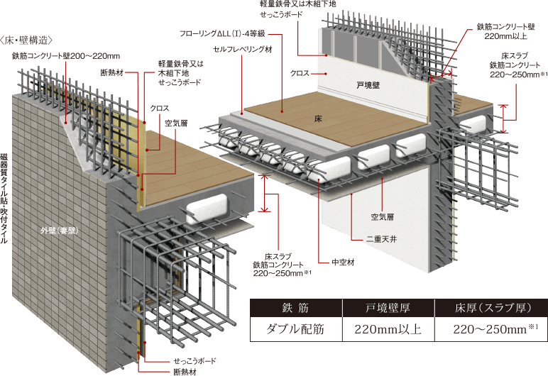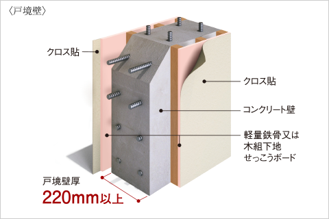 隣戸への音漏れに関係する戸境壁のコンクリート厚は、220mm厚以上として、日常生活に不便のない遮音性を実現しています。