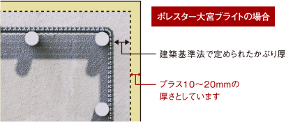 長く建物の性能を保つために重要なポイントとなる、鉄筋を覆うコンクリートのかぶり厚は、建築基準法で定められたかぶり厚よりもプラス10mmの厚さとしています。また、打放し仕上げ部分はさらにプラス10mm以上、合計20mmのかぶり厚として鉄筋の劣化を抑制しています。