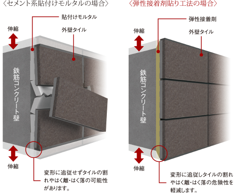 外壁タイルには、弾性接着剤貼り工法を採用。セメント系貼り付けモルタルに比べ、接着剤層の弾性でコンクリートの乾燥収縮率等による変形に追従し、タイルの浮きやはく離・はく落の危険性を軽減します。
