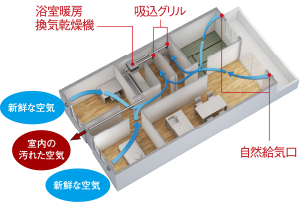 浴室暖房換気乾燥機を運転し外部に面する居室の給気口から新鮮な空気を取り入れる小風量換気を行います。24時間、新鮮な空気を循環させ快適な空気環境を保ちます。