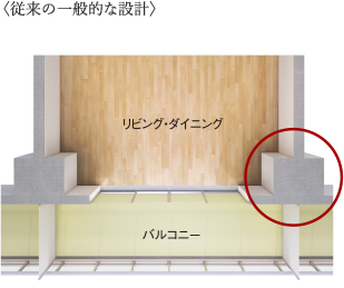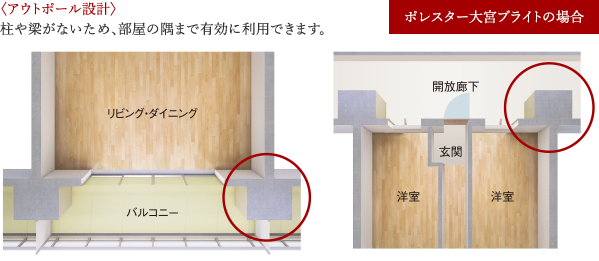 柱、梁をバルコニー・開放廊下側に押し出すアウトポール設計。部屋のコーナーがすっきりし家具の配置がしやすい構造です。