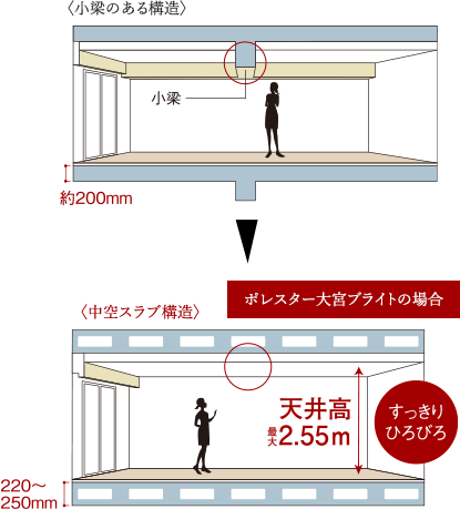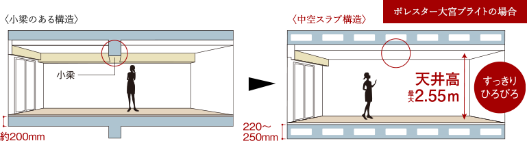 住戸内の開放感に大きな影響を与える天井高は、最大2.55mを確保。ゆとりある高さに加え、スラブ厚220~250mmの中空スラブ構造を採用することにより、小梁の出ないすっきりとした室内空間を実現しています。