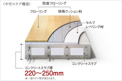 生活音の中で低音域の重い音(重量衝撃音)に対しては、220~250mmの中空スラブ構造を、高音域の軽い音(軽量衝撃音)に対しては軽量床衝撃音低減性能がΔLL(Ⅰ)-4等級のフローリング材を採用し階下への音の伝わりを抑えています。