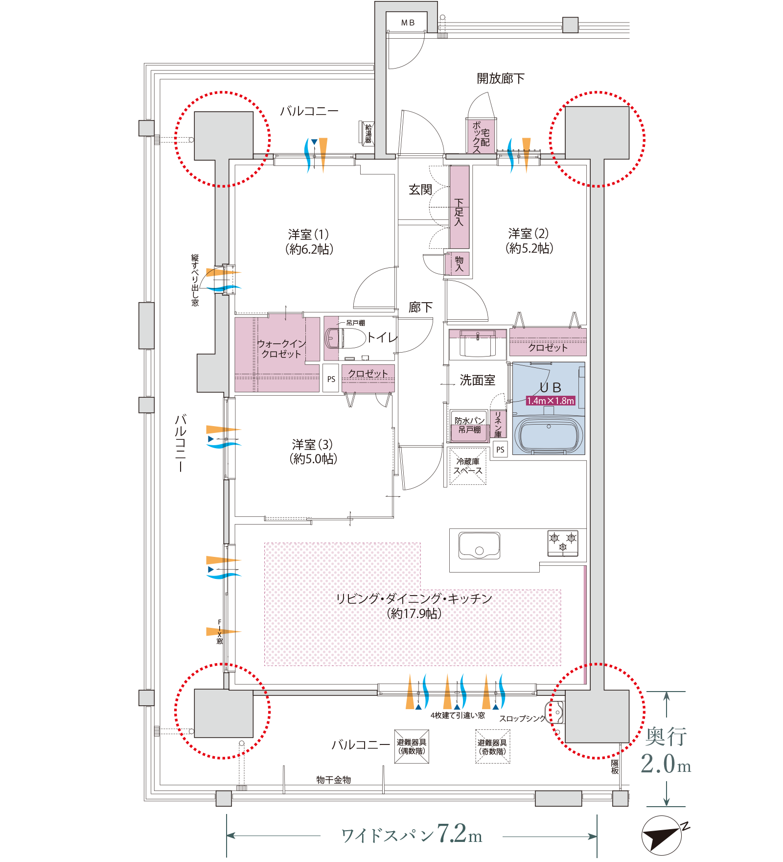 ※バルコニーの奥行は、壁の中心から手すり壁の中心までの寸法であり、実際に使用できる寸法とは異なります。