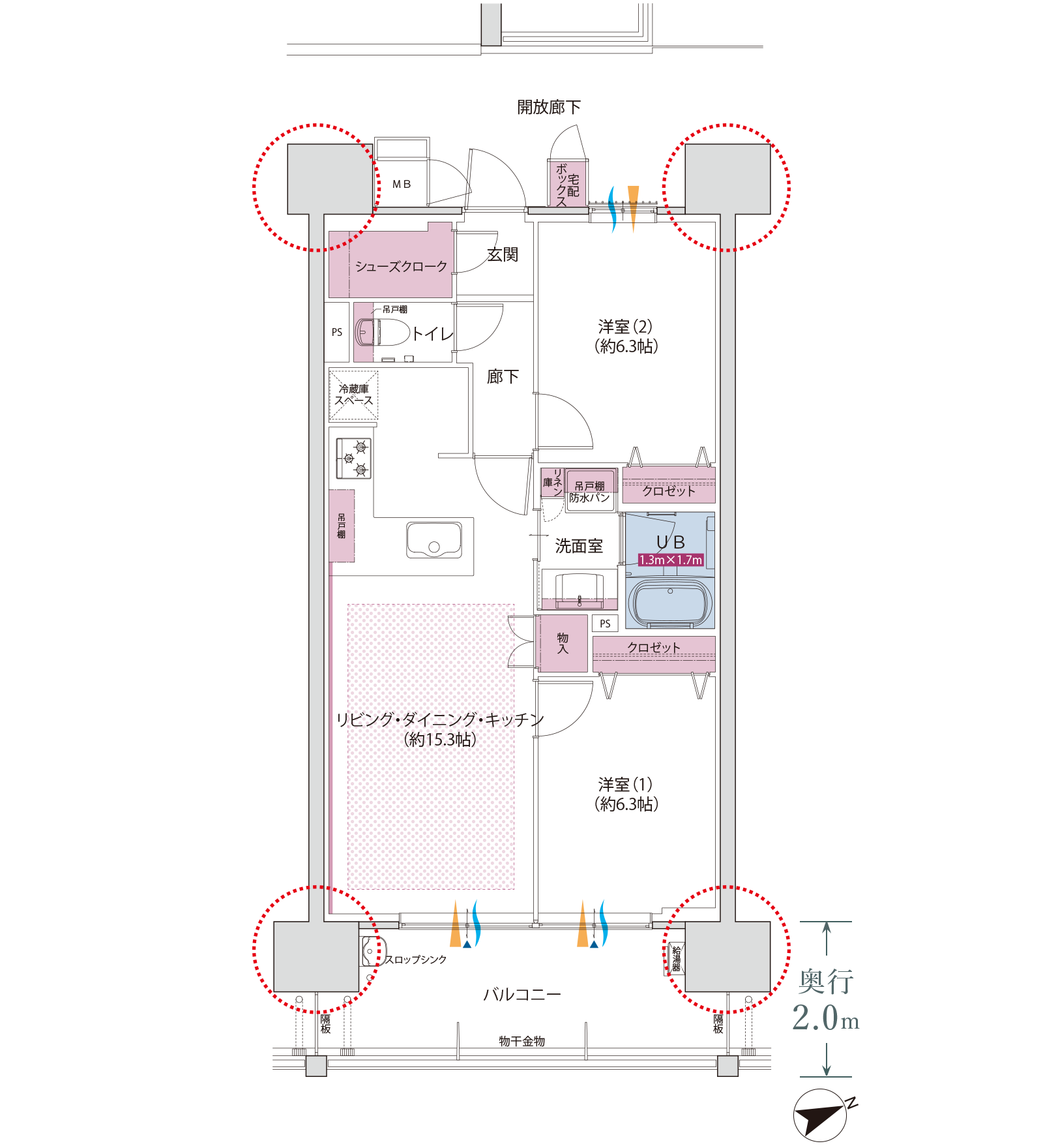 ※バルコニーの奥行は、壁の中心から手すり壁の中心までの寸法であり、実際に使用できる寸法とは異なります。