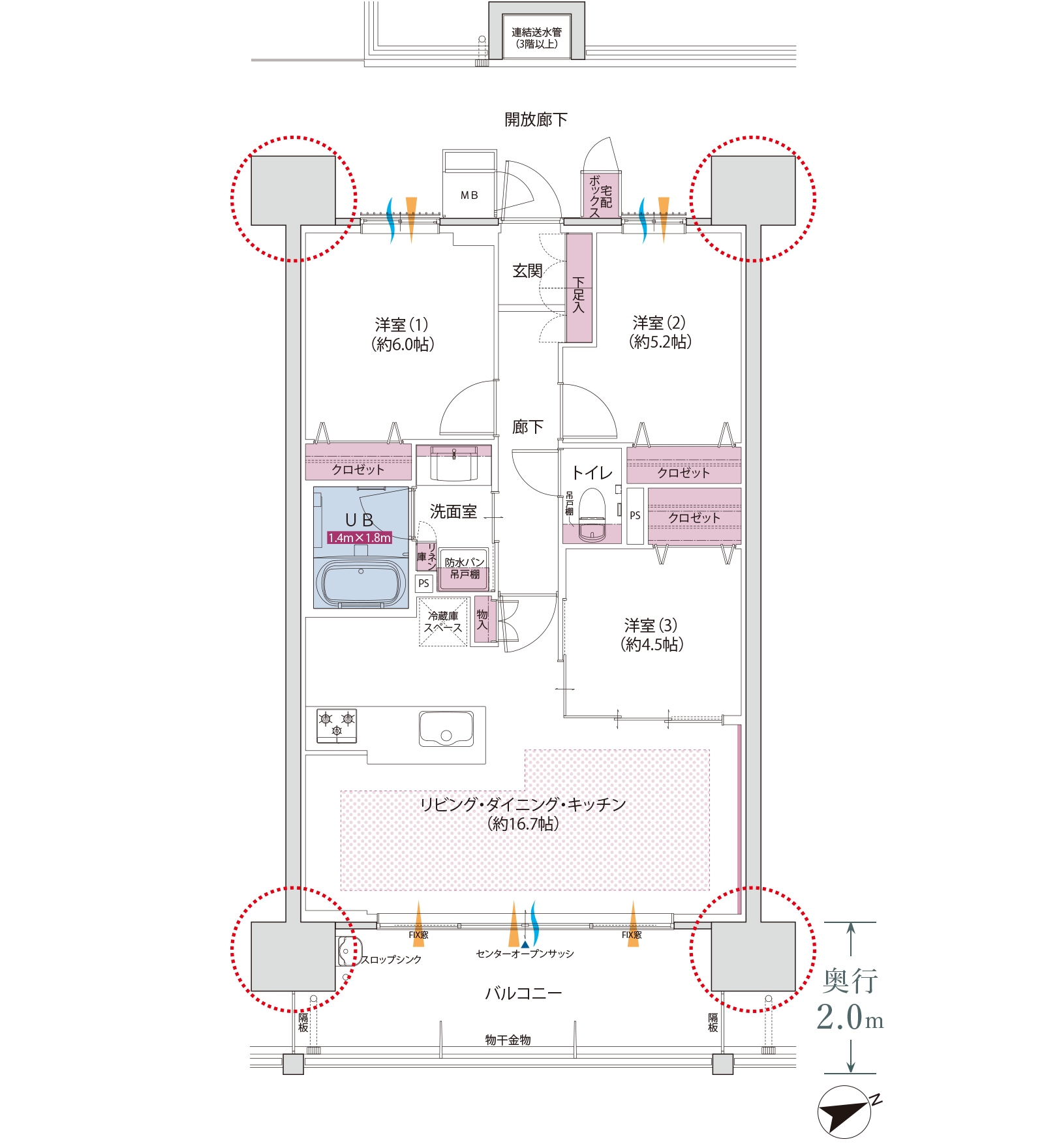 ※バルコニーの奥行は、壁の中心から手すり壁の中心までの寸法であり、実際に使用できる寸法とは異なります。