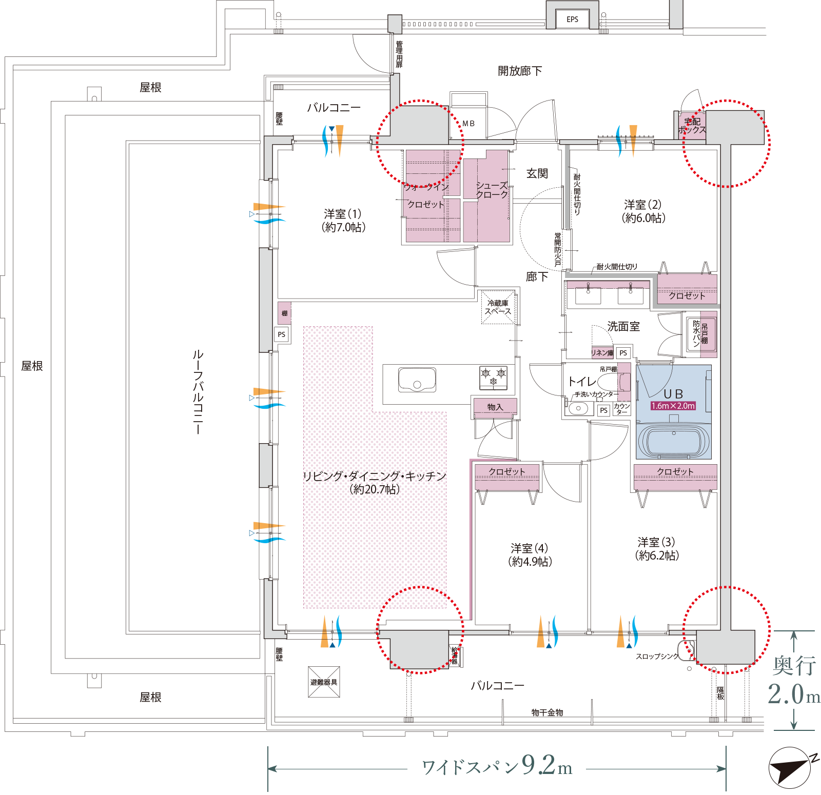 ※バルコニーの奥行は、壁の中心から手すり壁の中心までの寸法であり、実際に使用できる寸法とは異なります。