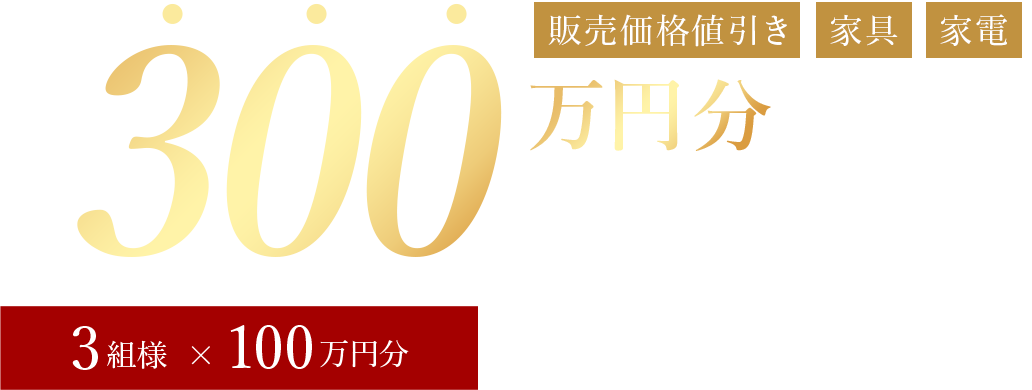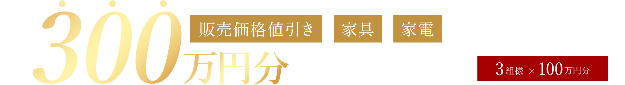 ※他のキャンペーン、割引、懸賞、特典、サービス等は併用できません。※対象外となる住戸がございます。※万が一ご契約を解除された場合、特典は無効となります。※ご契約者は、その権利を他人に譲渡することはできません。※プレゼントは1世帯1回限りとさせていただきます。※3組様のみのキャンペーンです。キャンペーン告知後、3組様に到達した時点で本キャンペーンは終了いたします。※家具・家電については、弊社が指定する店舗での購入となります。※商品のご提供は、ご契約住戸のお引き渡し後とさせていただきます。※商品によっては、納期に期間を要する場合がございます。※商品の発注後にご契約を解除された場合、商品の費用は自己負担とさせていただきます。※商品の購入金額が100万円(税込)に満たなかった場合のキャッシュバックや販売価格からの減額はいたしません。※詳しくは係員にお尋ねください。