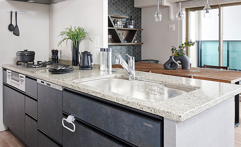 高級感のある人造大理石天板に、食器洗い乾燥機を備えたオープンカウンターキッチン。