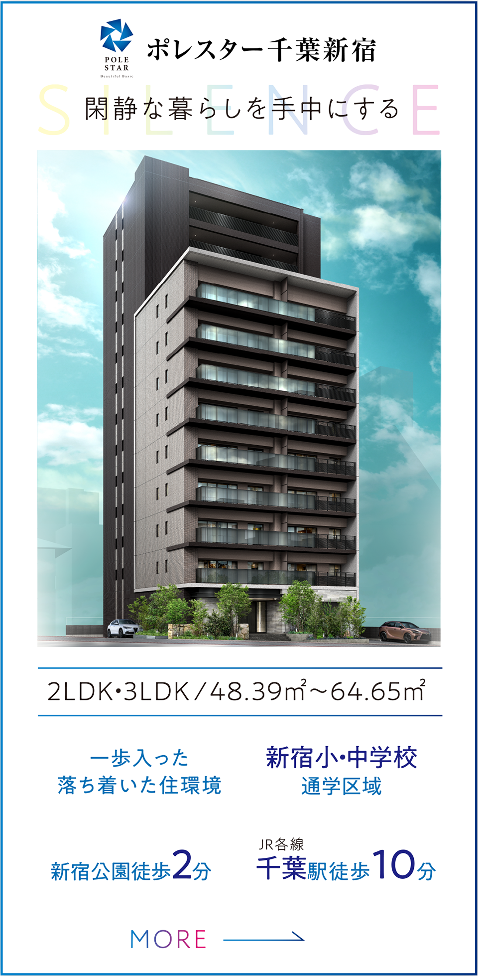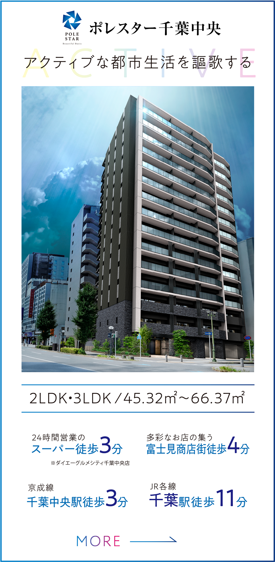 JR総武線など多くの路線が乗り入れ、駅周辺には大型商業施設の「千葉そごう」や「千葉ペリエ」などがあり、買い物や娯楽に便利な環境が整っていることから、「いい部屋ネット」の住みたい街ランキングで1順位を獲得しました。